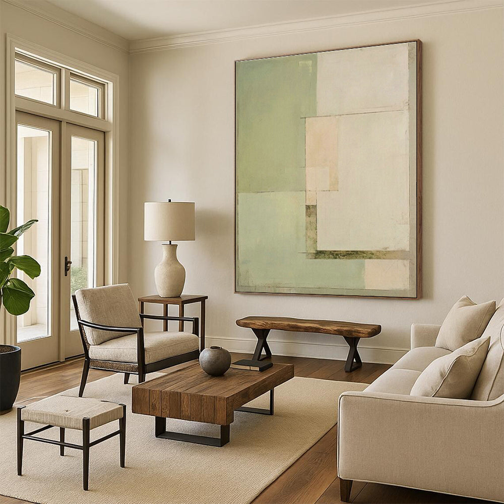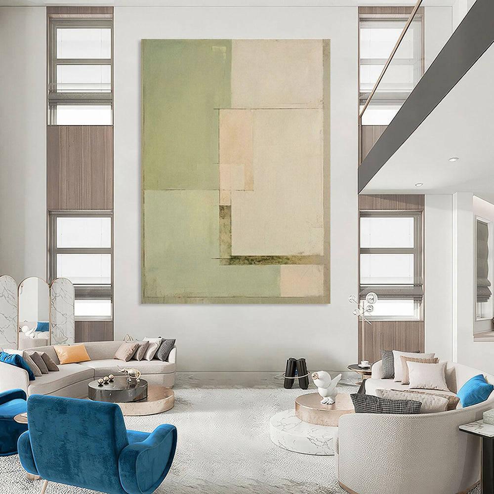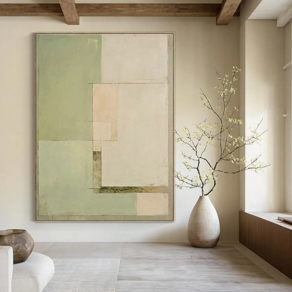 Clean mint - green shapes offer a fresh, calming energy. In a home office, place it above the desk to foster focus – the soft color palette keeps the space from feeling overwhelming, letting you concentrate on tasks. At a plant shop, hang it near potted greenery – the geometric forms and mint hues echo the natural world, enhancing the shop’s botanical charm and giving customers visual harmony as they browse for plants.Handmade Acrylic/oil painting on canvas, Unframed/Not stretched. Packing: Rolled and shipped in a solid tube. The painting come with EXTRA 2-3 inch white border around for stretching or framing. Delivery time: You will receive the painting around 7-12 days( 3-5 days to finish the painting, 5-7 days to your home.by Fedex And Dhl)