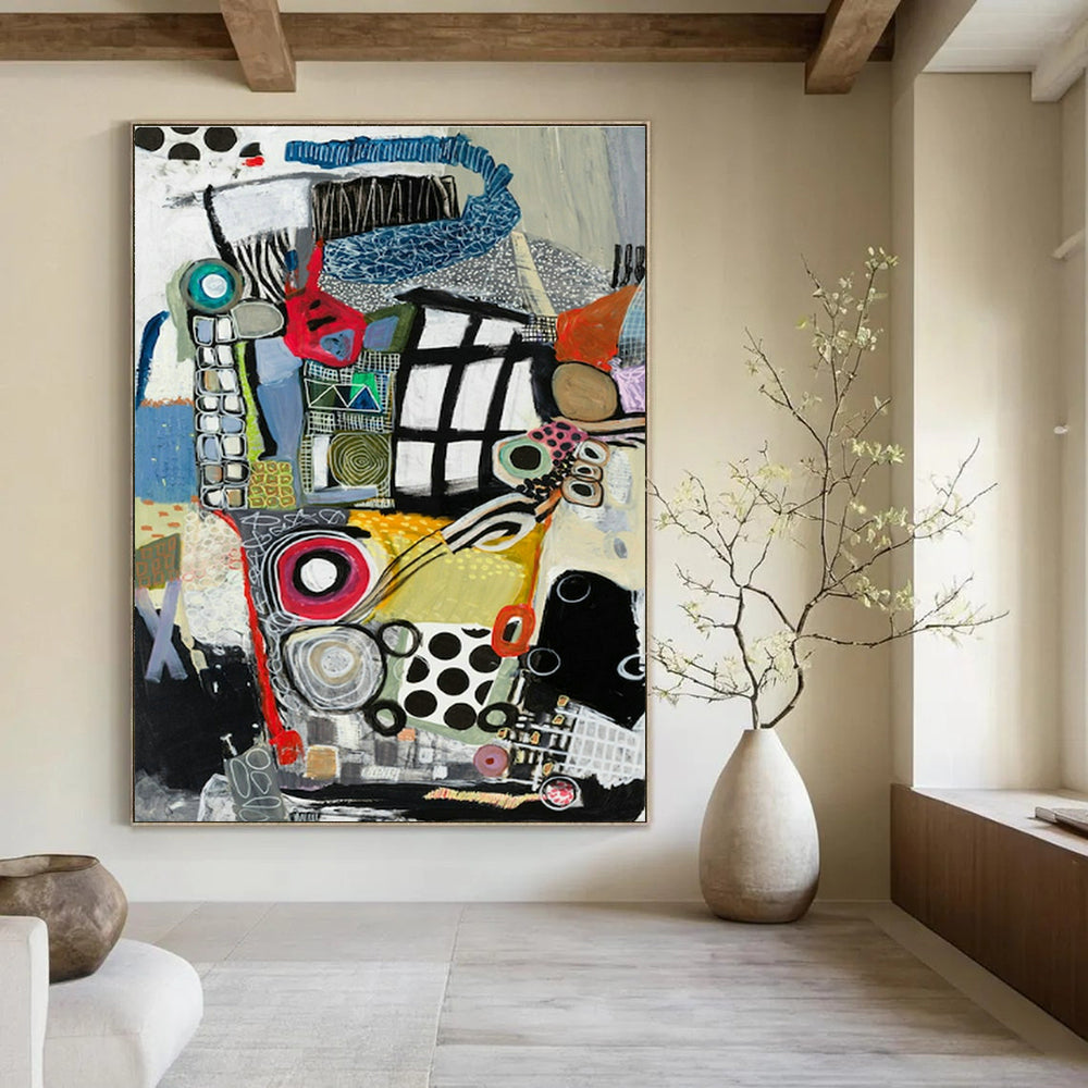 Drawn to mixed - media, the artist combined paint, patterns, and textures. They aimed to create a visually rich piece. Ideal for a bohemian gallery to showcase artistic diversity or an eclectic home living room to add an unconventional touch.Handmade Acrylic/oil painting on canvas, Unframed/Not stretched. Packing: Rolled and shipped in a solid tube. The painting come with EXTRA 2-3 inch white border around for stretching or framing. Delivery time: You will receive the painting around 7-12 days( 3-5 days to finish the painting, 5-7 days to your home.by Fedex And Dhl)