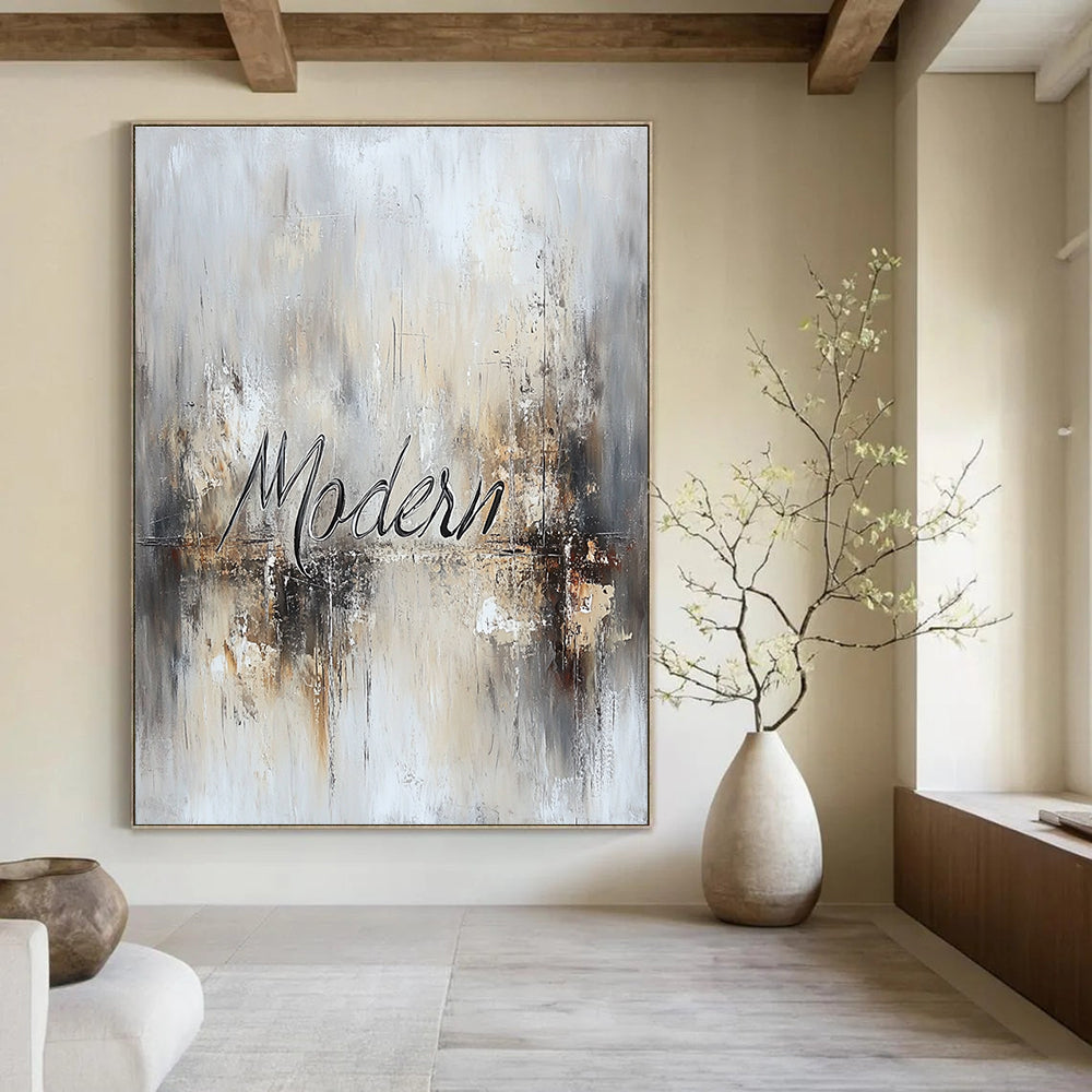 Aiming to merge text and texture, the artist painted the word “Modern” against a layered, textured background of grays and browns. The rough, artistic font and the mixed - media - like appearance reflected a contemporary aesthetic. Perfect for a contemporary office to emphasize a forward - thinking brand or a design showroom to align with modern design concepts.Handmade Acrylic/oil painting on canvas, Unframed/Not stretched. Packing: Rolled and shipped in a solid tube. The painting come with EXTRA 2-3 inch white border around for stretching or framing. Delivery time: You will receive the painting around 7-12 days( 3-5 days to finish the painting, 5-7 days to your home.by Fedex And Dhl)