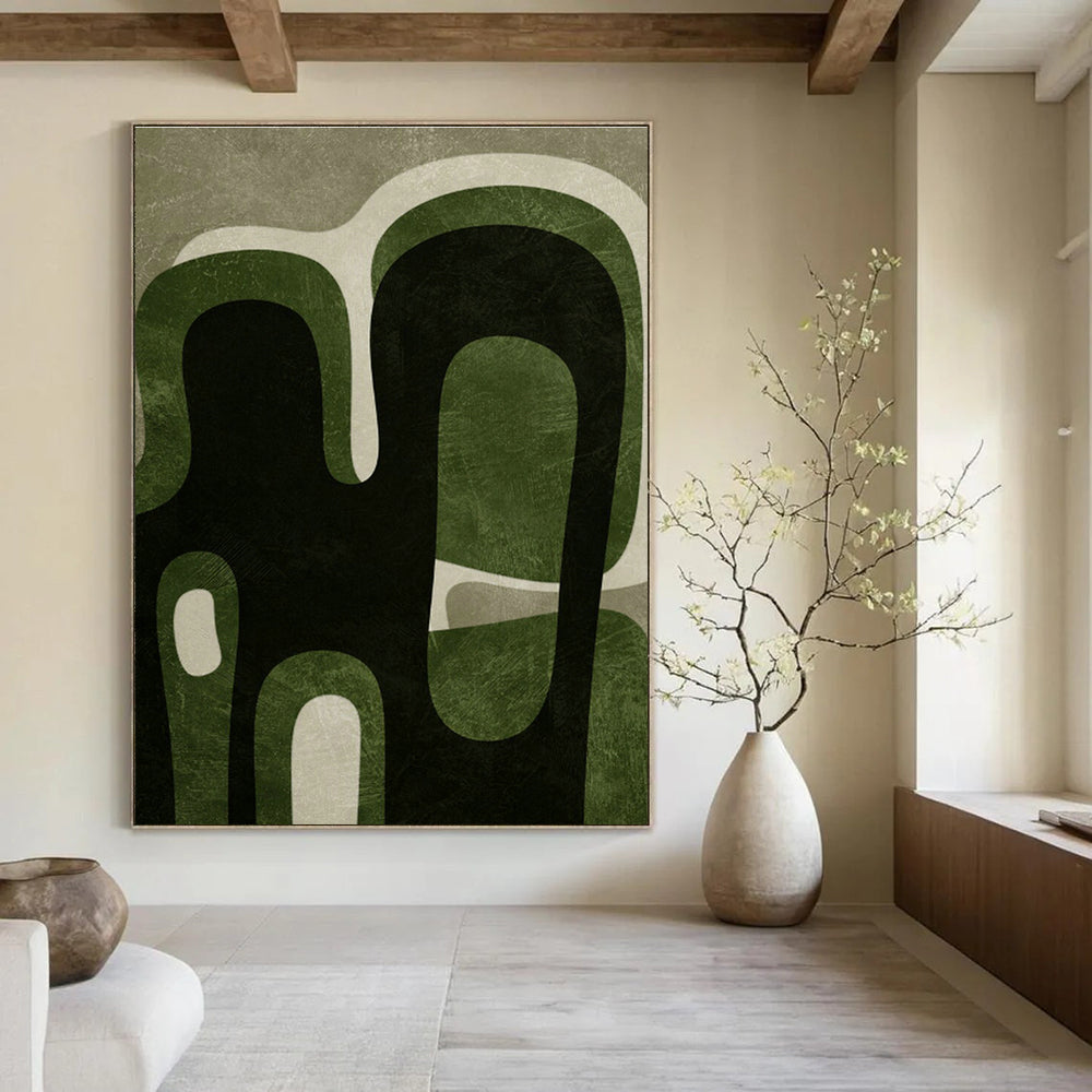A green backdrop with flowing black and olive - green shapes, capturing organic charm. In a bohemian nursery with canopy beds and nature - themed mobiles, hang it above the changing table. Its soft, organic forms and earthy tones inspire wonder in little ones, fostering a love for nature from the start—perfect for a space that celebrates growth and creativity. In a garden - themed retail store (like a plant shop or home decor boutique), display it near the entrance. The organic shapes align with the store’s botanical focus, while the abstract art adds a unique, artistic touch, enticing customers to explore the space and discover nature - inspired products.Handmade Acrylic/oil painting on canvas, Unframed/Not stretched. Packing: Rolled and shipped in a solid tube. The painting come with EXTRA 2-3 inch white border around for stretching or framing. Delivery time: You will receive the painting around 7-12 days( 3-5 days to finish the painting, 5-7 days to your home.by Fedex And Dhl)