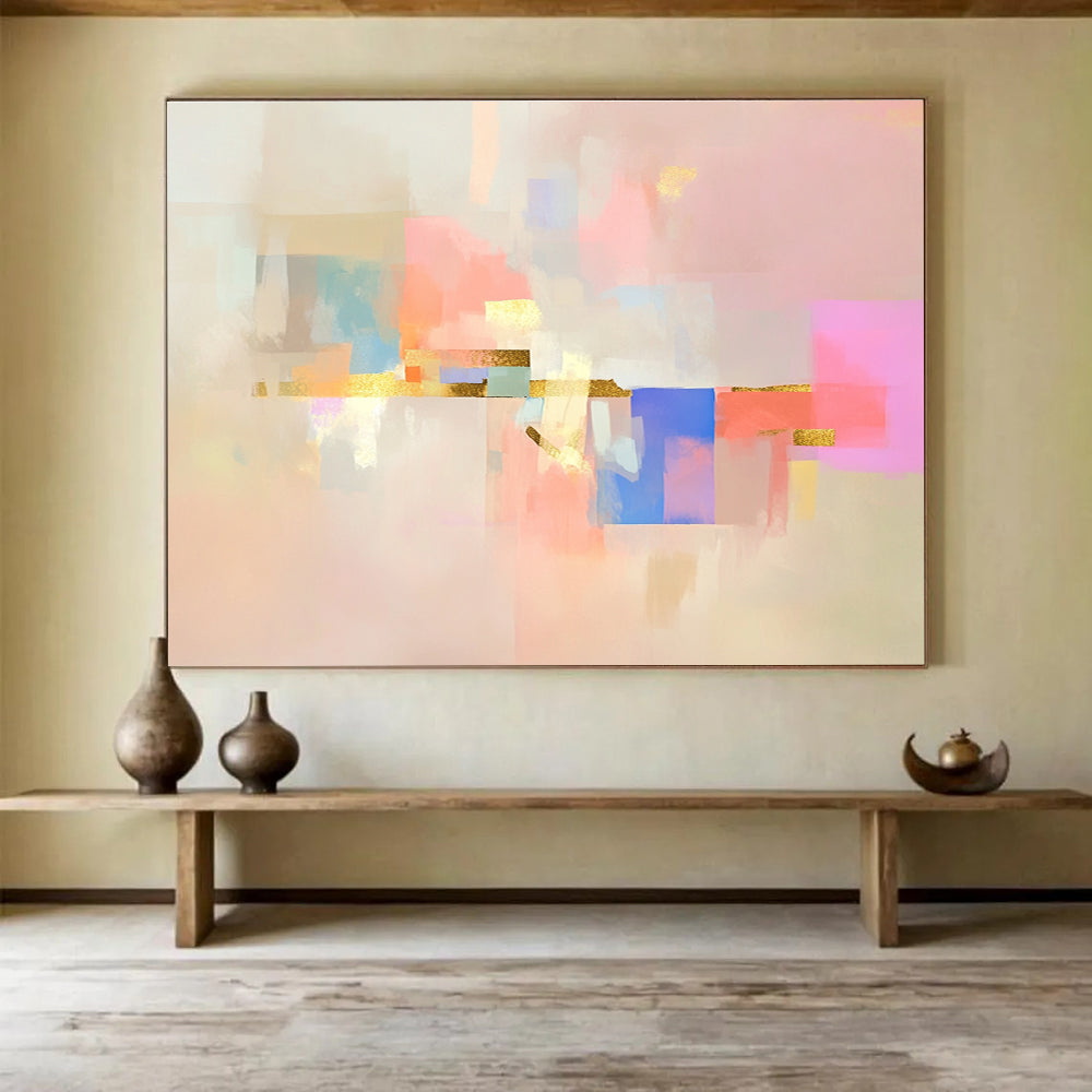 The artist combined soft pastels for a gentle vibe, then added gold to bring luxury. Each shape blends to create harmony, symbolizing success and elegance. Suitable for a luxury bridal suite to create romance or a high - end home office to inspire a refined work ethic.Handmade Acrylic/oil painting on canvas, Unframed/Not stretched. Packing: Rolled and shipped in a solid tube. The painting come with EXTRA 2-3 inch white border around for stretching or framing. Delivery time: You will receive the painting around 7-12 days( 3-5 days to finish the painting, 5-7 days to your home.by Fedex And Dhl)