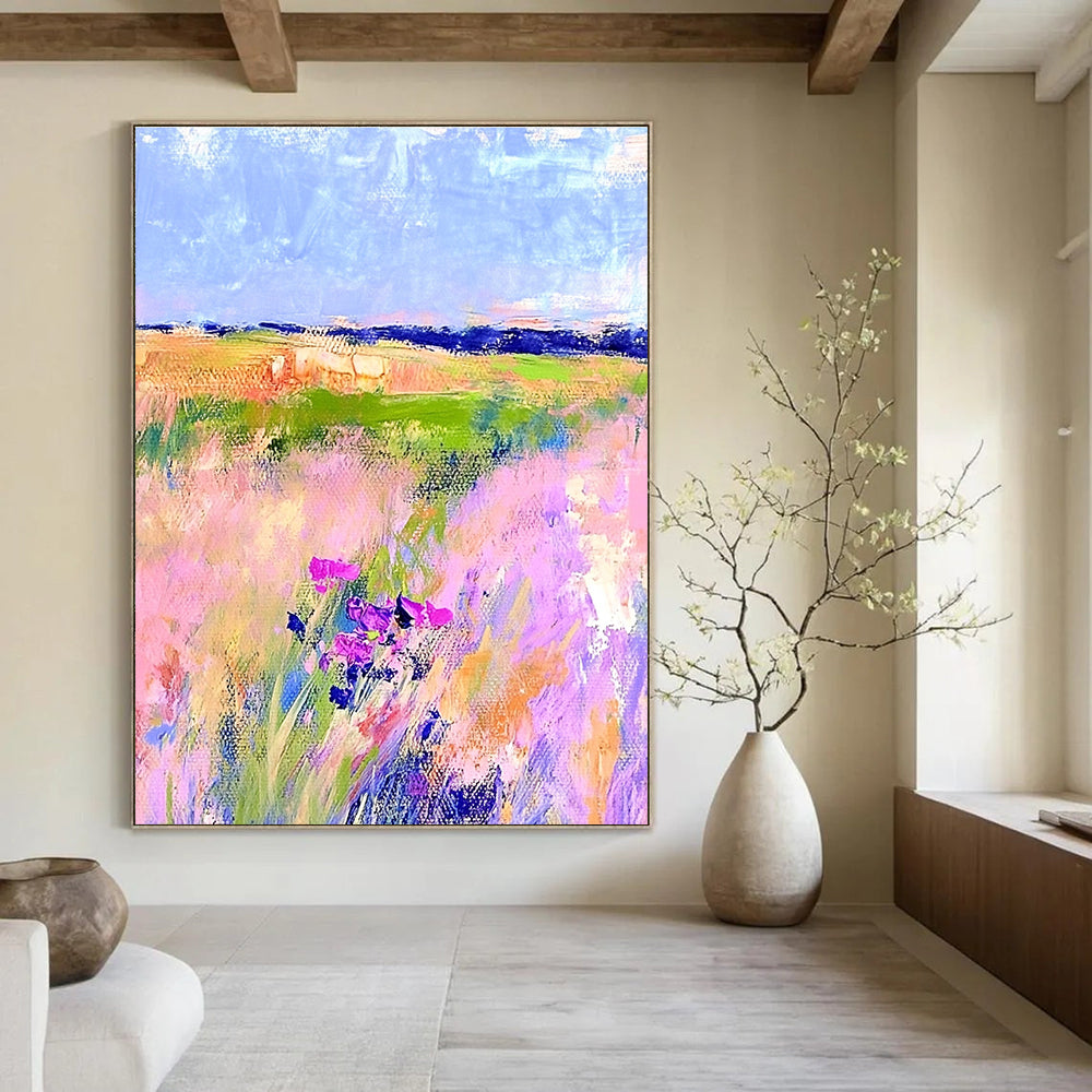 Inspired by the romance of a pink field filled with flowers, the artist used soft, pastel colors to create this dreamy landscape. They aimed to evoke a sense of love and beauty. The loose brushstrokes give the painting a whimsical feel. In a romantic home bedroom, it adds a touch of sweetness and intimacy, creating a perfect setting for relaxation. In a feminine art boutique, it complements the delicate and beautiful items, enhancing the overall shopping experience.Handmade Acrylic/oil painting on canvas, Unframed/Not stretched. Packing: Rolled and shipped in a solid tube. The painting come with EXTRA 2-3 inch white border around for stretching or framing. Delivery time: You will receive the painting around 7-12 days( 3-5 days to finish the painting, 5-7 days to your home.by Fedex And Dhl)