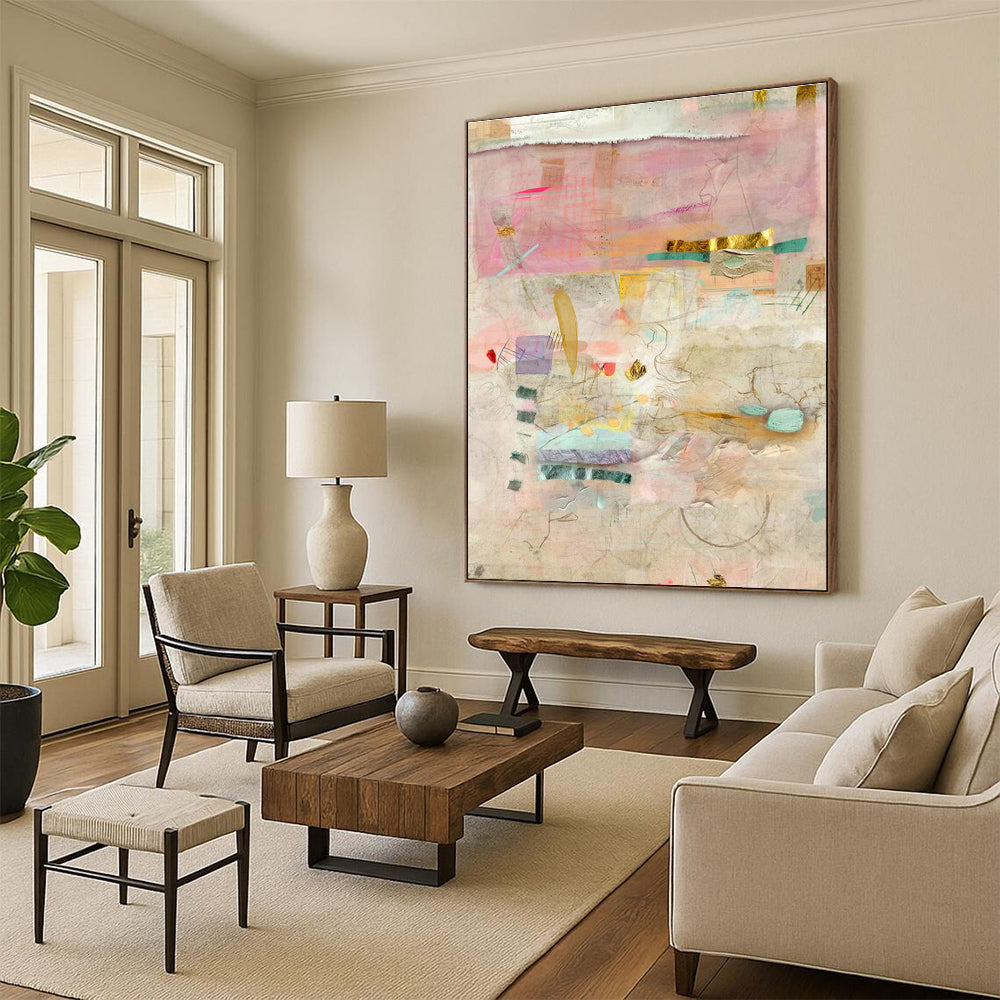 Elegant pinks, shimmering golds. Elevate hotel lobby lounges with a sophisticated, artistic vibe, impressing guests from the start.Handmade Acrylic/oil painting on canvas, Unframed/Not stretched. Packing: Rolled and shipped in a solid tube. The painting come with EXTRA 2-3 inch white border around for stretching or framing. Delivery time: You will receive the painting around 7-12 days( 3-5 days to finish the painting, 5-7 days to your home.by Fedex And Dhl)