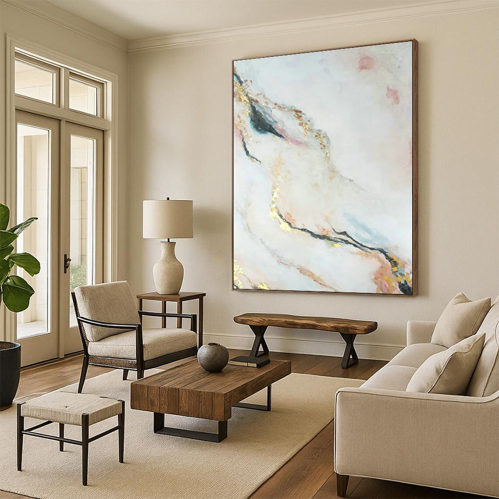 The soft pink, gold, and marble - like patterns exude luxury and charm. In a boutique hotel lobby, it welcomes guests with a high - end, stylish look, setting the tone for a lavish stay, as if the lobby is paved with precious marble. For a glam bathroom, it transforms the space into a spa - like retreat, the pink and gold making every bath feel like a pampering session in a fancy resort.Handmade Acrylic/oil painting on canvas, Unframed/Not stretched. Packing: Rolled and shipped in a solid tube. The painting come with EXTRA 2-3 inch white border around for stretching or framing. Delivery time: You will receive the painting around 7-12 days( 3-5 days to finish the painting, 5-7 days to your home.by Fedex And Dhl)
