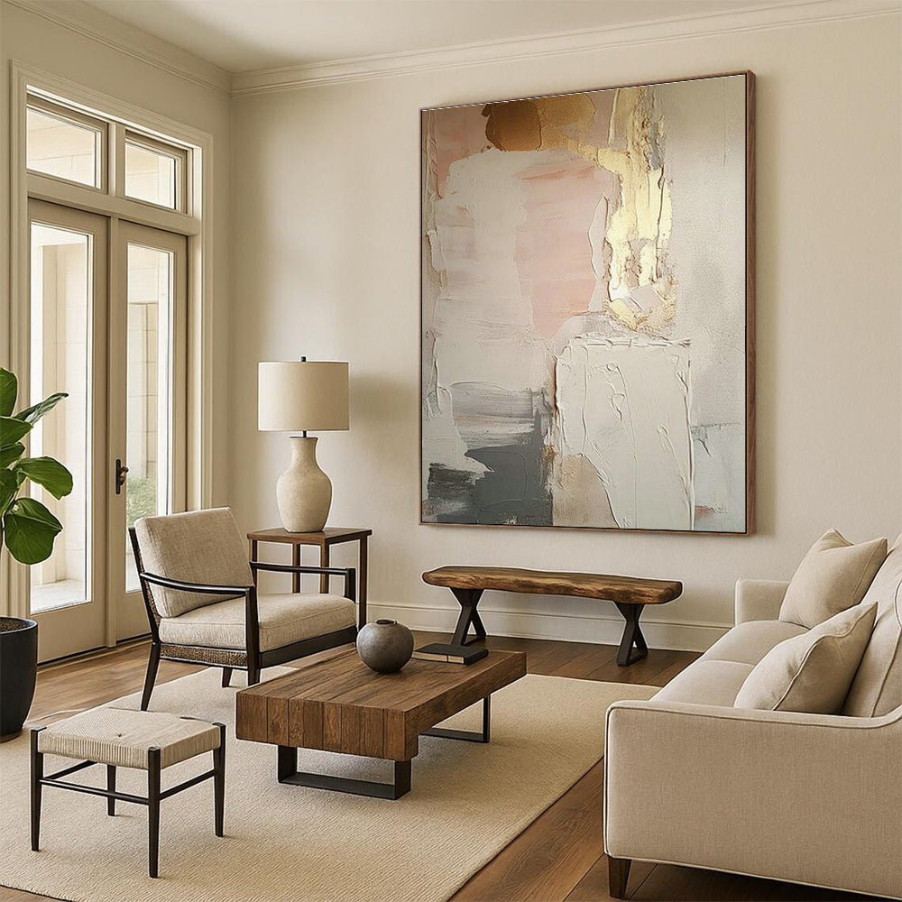 Soft pinks meet luxe gold, creating a calming, elegant vibe. Perfect for spa lounges, helping guests unwind before treatments.Handmade Acrylic/oil painting on canvas, Unframed/Not stretched. Packing: Rolled and shipped in a solid tube. The painting come with EXTRA 2-3 inch white border around for stretching or framing. Delivery time: You will receive the painting around 7-12 days( 3-5 days to finish the painting, 5-7 days to your home.by Fedex And Dhl)