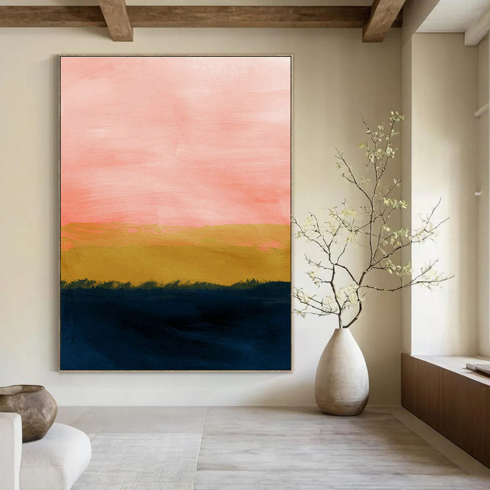 Soft pink and warm yellow layers mimic a serene sunset. In a beach house, placed in the living room, it reflects the coastal sunset views, making lazy afternoons feel like a permanent vacation, as if the beach sunset is captured right inside the house. In a bohemian living room, it adds a free - spirited, artistic touch, the colors blending with boho decor and creating a laid - back, dreamy atmosphere for gatherings.Handmade Acrylic/oil painting on canvas, Unframed/Not stretched. Packing: Rolled and shipped in a solid tube. The painting come with EXTRA 2-3 inch white border around for stretching or framing. Delivery time: You will receive the painting around 7-12 days( 3-5 days to finish the painting, 5-7 days to your home.by Fedex And Dhl)