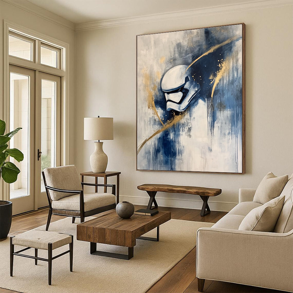 Featuring a Stormtrooper helmet, this artwork combines pop - culture reference with abstract techniques. The artist used bold colors and splashes to give it a modern twist. Perfect for a game room, showing off a love for sci - fi, or a man cave, adding a unique and cool element to the space.Handmade Acrylic/oil painting on canvas, Unframed/Not stretched. Packing: Rolled and shipped in a solid tube. The painting come with EXTRA 2-3 inch white border around for stretching or framing. Delivery time: You will receive the painting around 7-12 days( 3-5 days to finish the painting, 5-7 days to your home.by Fedex And Dhl)