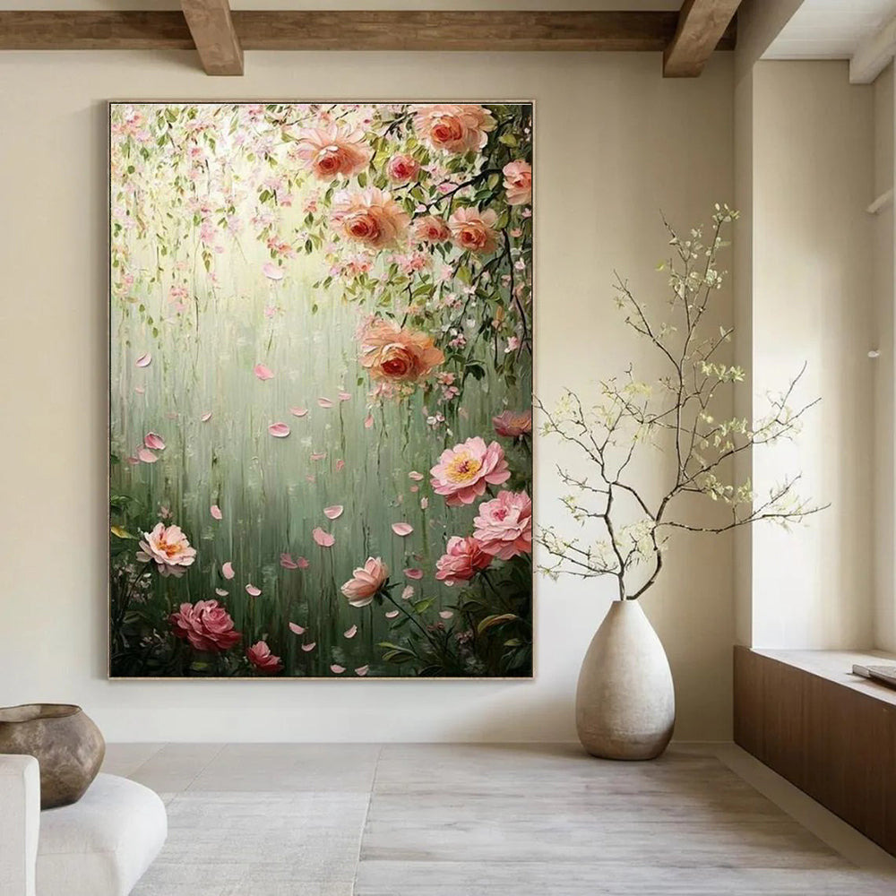 Aiming to evoke a sense of romantic whimsy, the artist painted delicate flowers and falling petals against a soft, flowing background, like a floral waterfall. Using gentle brushstrokes and pastel colors, they created a dreamy, ethereal scene. Perfect for a wedding venue lounge to set a romantic mood or a feminine boudoir to add a touch of grace and beauty.Handmade Acrylic/oil painting on canvas, Unframed/Not stretched. Packing: Rolled and shipped in a solid tube. The painting come with EXTRA 2-3 inch white border around for stretching or framing. Delivery time: You will receive the painting around 7-12 days( 3-5 days to finish the painting, 5-7 days to your home.by Fedex And Dhl)