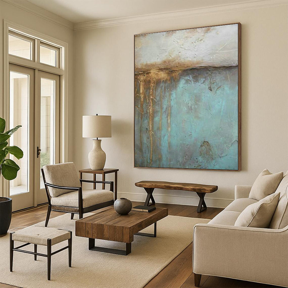 A mix of brown and teal textures creates a rustic - industrial vibe. In a farmhouse kitchen, with wooden cabinets and vintage utensils, it adds character. The weathered look complements the space’s cozy, nostalgic feel. In an industrial loft, with exposed pipes and metal furniture, it fits the raw aesthetic. The textured layers enhance the loft’s edgy charm, making it a talking point for guests.Handmade Acrylic/oil painting on canvas, Unframed/Not stretched. Packing: Rolled and shipped in a solid tube. The painting come with EXTRA 2-3 inch white border around for stretching or framing. Delivery time: You will receive the painting around 7-12 days( 3-5 days to finish the painting, 5-7 days to your home.by Fedex And Dhl)