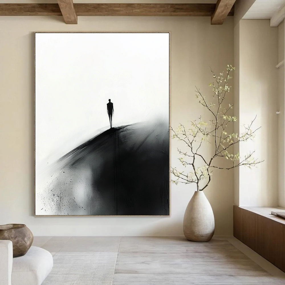 Driven by themes of solitude and self - reflection, the artist created a minimalist silhouette on a hill. The black and white palette adds a sense of drama and contemplation. In a serene meditation room, it fosters a peaceful and introspective atmosphere, perfect for mindfulness. In an abstract art exhibition, it stands as a powerful and minimalist work, inviting viewers to explore the depth of human emotion and the beauty of simplicity.Handmade Acrylic/oil painting on canvas, Unframed/Not stretched. Packing: Rolled and shipped in a solid tube. The painting come with EXTRA 2-3 inch white border around for stretching or framing. Delivery time: You will receive the painting around 7-12 days( 3-5 days to finish the painting, 5-7 days to your home.by Fedex And Dhl)