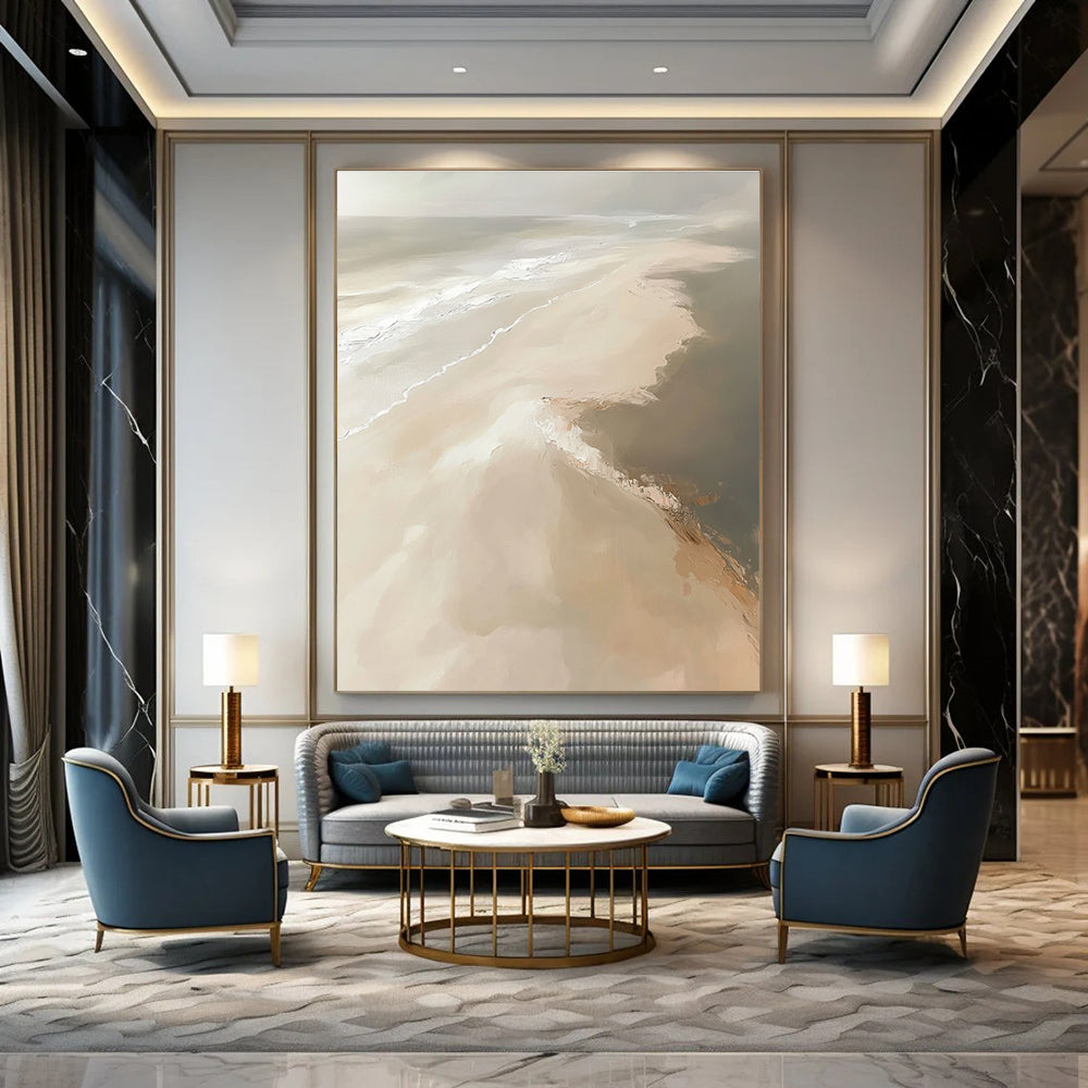 Inspired by the serene beauty of a beach from above, the artist used muted, sandy tones and gentle brushstrokes. The minimalist style captures the tranquil essence of the shoreline. Great for a Scandinavian - style bedroom to maintain a clean, peaceful look or a coastal home living room to bring in the beach’s laid - back, relaxing vibe.Handmade Acrylic/oil painting on canvas, Unframed/Not stretched. Packing: Rolled and shipped in a solid tube. The painting come with EXTRA 2-3 inch white border around for stretching or framing. Delivery time: You will receive the painting around 7-12 days( 3-5 days to finish the painting, 5-7 days to your home.by Fedex And Dhl)
