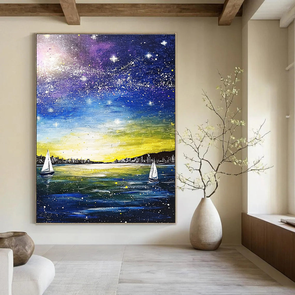 Fascinated by the night sky and sea, the artist combined deep blues, purples, and bright stars. The calm sea and sailing boats create a peaceful mood. Great for a coastal home office to inspire a serene mindset or a relaxation lounge to promote calm.Handmade Acrylic/oil painting on canvas, Unframed/Not stretched. Packing: Rolled and shipped in a solid tube. The painting come with EXTRA 2-3 inch white border around for stretching or framing. Delivery time: You will receive the painting around 7-12 days( 3-5 days to finish the painting, 5-7 days to your home.by Fedex And Dhl)
