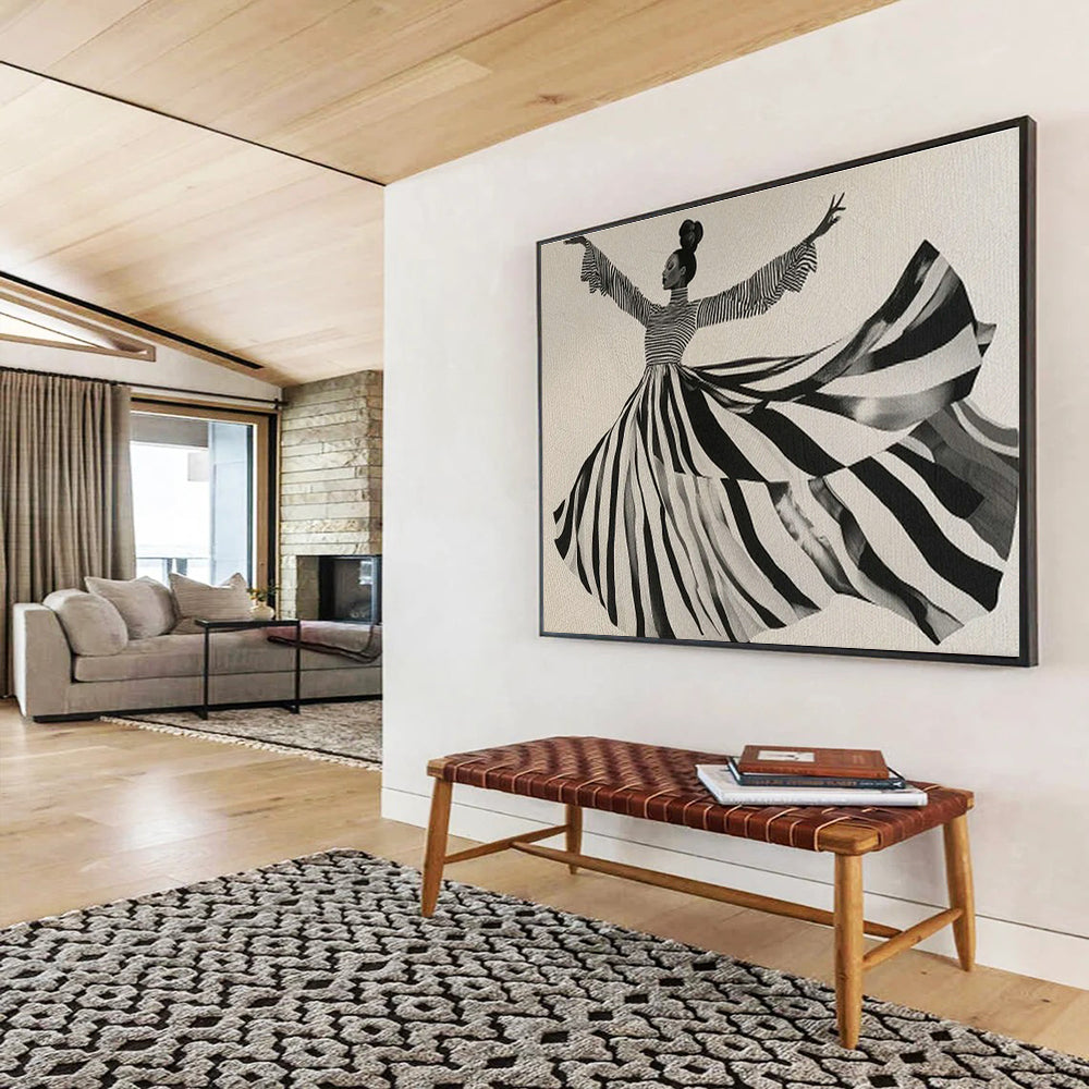 Bring Art Deco flair to dance studio walls with this striped - dress dancing figure art. Bold, graphic lines and a dynamic pose capture the essence of movement. Perfect for dance studios, it turns the space into a visual performance, motivating dancers to express themselves freely.Handmade Acrylic/oil painting on canvas, Unframed/Not stretched. Packing: Rolled and shipped in a solid tube. The painting come with EXTRA 2-3 inch white border around for stretching or framing. Delivery time: You will receive the painting around 7-12 days( 3-5 days to finish the painting, 5-7 days to your home.by Fedex And Dhl)