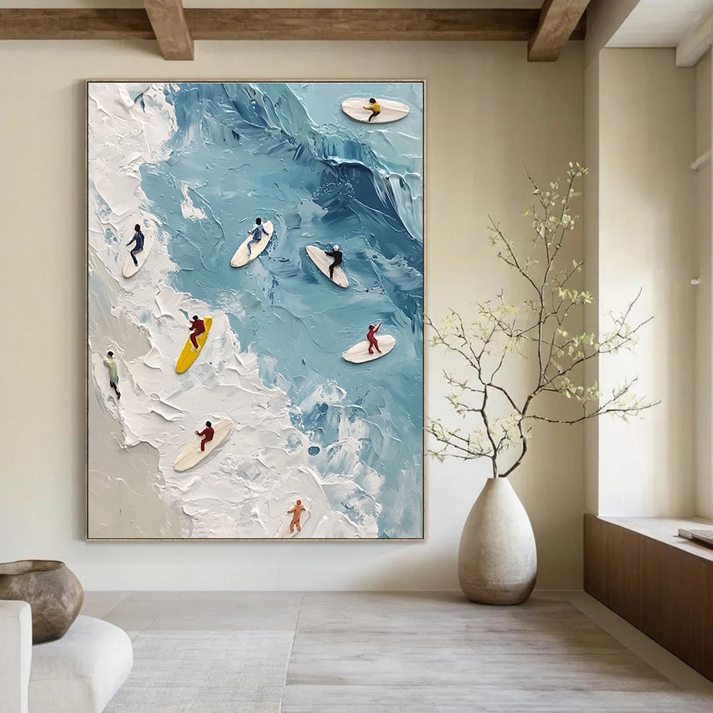 Fascinated by the energy of surfers riding the waves, the artist created this 3D - like painting with textured paint and small surfer figures. It captures the thrill of beach sports. In a beach sports club, it resonates with members’ love for surfing, creating an energetic atmosphere. In a vibrant home living room, it brings the excitement of the beach indoors, making the space feel lively and active.Handmade Acrylic/oil painting on canvas, Unframed/Not stretched. Packing: Rolled and shipped in a solid tube. The painting come with EXTRA 2-3 inch white border around for stretching or framing. Delivery time: You will receive the painting around 7-12 days( 3-5 days to finish the painting, 5-7 days to your home.by Fedex And Dhl)