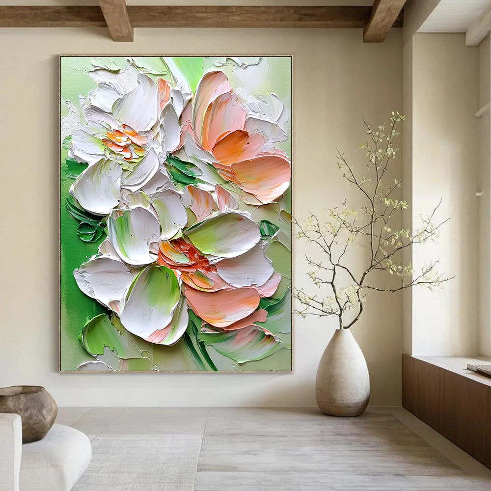 Motivated by the lushness of garden flowers, the artist employed a palette knife to create thick, textured petals. Each stroke is deliberate, aiming to recreate the softness and vibrancy of real blooms. The green background serves to make the white and pink flowers pop, evoking a sense of freshness. In a botanical spa, this artwork complements the natural, relaxing atmosphere, allowing guests to feel immersed in a floral oasis. In an elegant garden - themed living room, it acts as a centerpiece, bringing the beauty of the outdoors inside and adding a touch of sophistication.Handmade Acrylic/oil painting on canvas, Unframed/Not stretched. Packing: Rolled and shipped in a solid tube. The painting come with EXTRA 2-3 inch white border around for stretching or framing. Delivery time: You will receive the painting around 7-12 days( 3-5 days to finish the painting, 5-7 days to your home.by Fedex And Dhl)