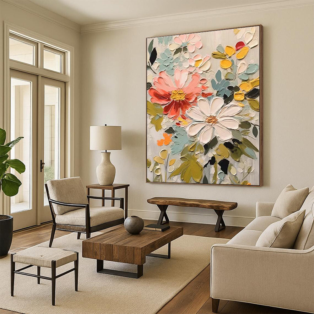 Thick, vibrant brushstrokes form a lively flower bouquet, bursting with colors like soft pinks, whites, and fresh greens. In a shabby - chic kitchen, adorned with vintage floral plates and lace curtains, it adds a charming, romantic touch. Cooking breakfast or baking treats feels more like a stroll through a garden, with the art as a cheerful companion. In a garden - themed café, where potted plants and floral - printed menus set the scene, the bouquet art fits right in. Patrons sipping tea and enjoying pastries are surrounded by floral beauty, making their café experience a sweet, garden - like escape.Handmade Acrylic/oil painting on canvas, Unframed/Not stretched. Packing: Rolled and shipped in a solid tube. The painting come with EXTRA 2-3 inch white border around for stretching or framing. Delivery time: You will receive the painting around 7-12 days( 3-5 days to finish the painting, 5-7 days to your home.by Fedex And Dhl)