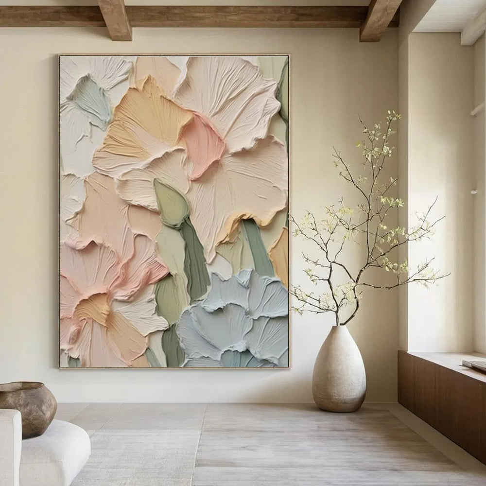 Soft, pastel - hued flowers with thick, sculptural brushstrokes. In a bohemian bedroom filled with dreamcatchers, layered textiles, and warm - toned lighting, this art adds a gentle, romantic touch. The pastel colors blend seamlessly with the boho aesthetic, creating a cozy, artistic haven for rest. In a garden - themed café adorned with potted plants, floral - patterned tablecloths, and natural wood furniture, hang it near the entrance. The textured flowers mirror the café’s botanical vibe, enhancing the inviting atmosphere as customers step in for a coffee and a moment of visual delight.Handmade Acrylic/oil painting on canvas, Unframed/Not stretched. Packing: Rolled and shipped in a solid tube. The painting come with EXTRA 2-3 inch white border around for stretching or framing. Delivery time: You will receive the painting around 7-12 days( 3-5 days to finish the painting, 5-7 days to your home.by Fedex And Dhl)