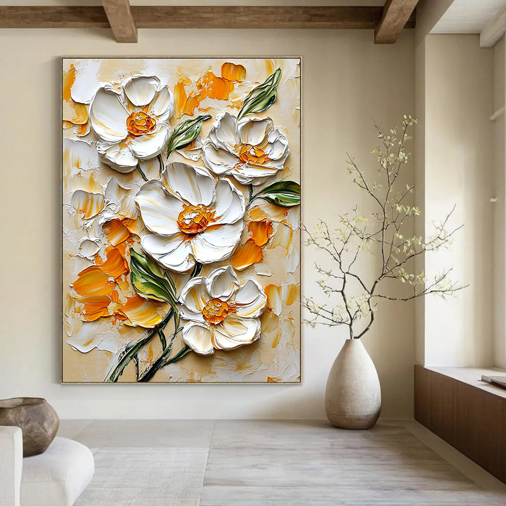 Fascinated by floral beauty and texture, the artist used thick paint to make flowers pop. The piece celebrates nature’s elegance. In a floral - themed spa, it complements the calming, natural environment. In an elegant dining room, it adds a touch of sophistication, perfect for special meals.Handmade Acrylic/oil painting on canvas, Unframed/Not stretched. Packing: Rolled and shipped in a solid tube. The painting come with EXTRA 2-3 inch white border around for stretching or framing. Delivery time: You will receive the painting around 7-12 days( 3-5 days to finish the painting, 5-7 days to your home.by Fedex And Dhl)