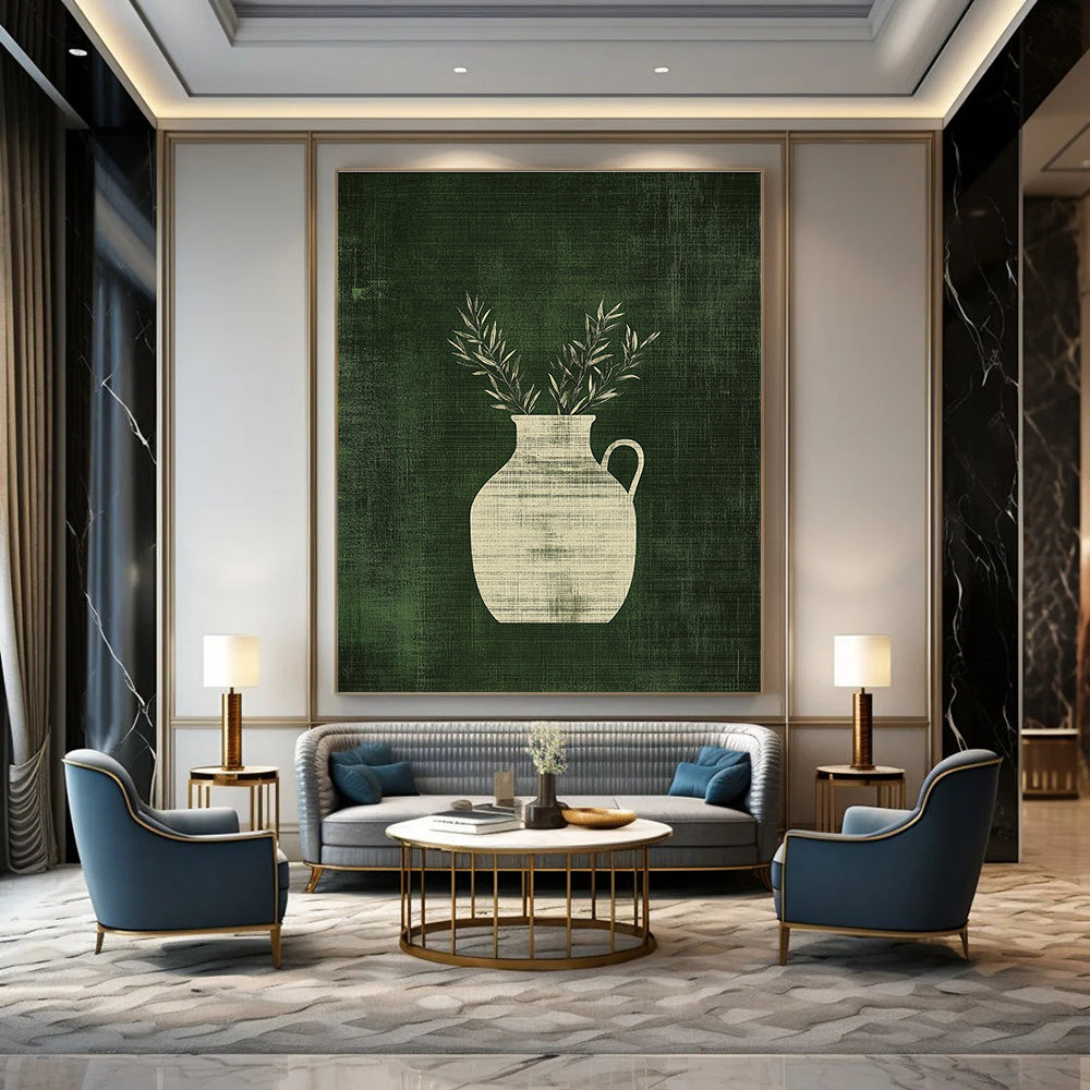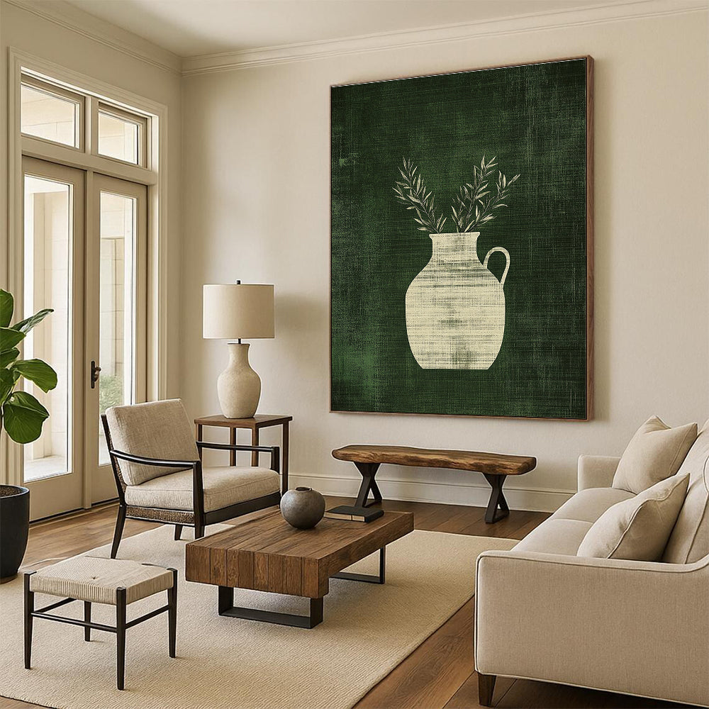 Drawn to the beauty of simplicity and nature, the artist created this minimalist vase with branches. They used a dark green background and a textured, light - colored vase to create a contrast that highlights the natural elements. The goal was to bring a touch of the outdoors inside. In a rustic home kitchen, it complements the cozy, natural decor, adding a fresh and organic feel. In a botanical café, it enhances the plant - inspired atmosphere, making patrons feel closer to nature while enjoying their time.Handmade Acrylic/oil painting on canvas, Unframed/Not stretched. Packing: Rolled and shipped in a solid tube. The painting come with EXTRA 2-3 inch white border around for stretching or framing. Delivery time: You will receive the painting around 7-12 days( 3-5 days to finish the painting, 5-7 days to your home.by Fedex And Dhl)