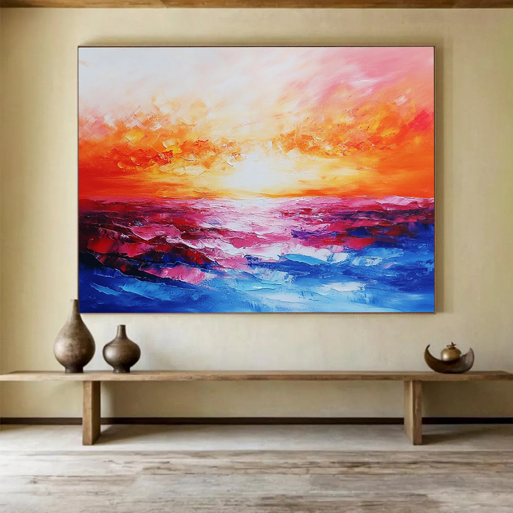 Enchanted by fiery sunsets, the artist applied thick, colorful paint. Textured layers mimic ocean waves. Ideal for a beachfront bar’s lively atmosphere or a bold dining room to make a statement.Handmade Acrylic/oil painting on canvas, Unframed/Not stretched. Packing: Rolled and shipped in a solid tube. The painting come with EXTRA 2-3 inch white border around for stretching or framing. Delivery time: You will receive the painting around 7-12 days( 3-5 days to finish the painting, 5-7 days to your home.by Fedex And Dhl)