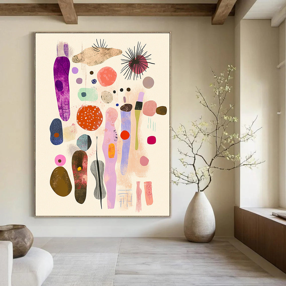 Motivated by the imagination of childhood, the artist created a collection of whimsical shapes and forms. They aimed to inspire a sense of wonder. In a quirky home kids’ room, it stimulates children’s creativity and makes the space more fun and imaginative. In an art - centric community center, it adds a playful and inviting element, encouraging community members to engage with art in a light - hearted way.Handmade Acrylic/oil painting on canvas, Unframed/Not stretched. Packing: Rolled and shipped in a solid tube. The painting come with EXTRA 2-3 inch white border around for stretching or framing. Delivery time: You will receive the painting around 7-12 days( 3-5 days to finish the painting, 5-7 days to your home.by Fedex And Dhl)