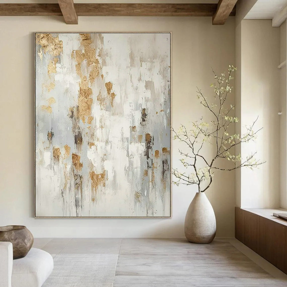 Gentle white, gray, and gold tones create a serene and luxurious atmosphere. In a Scandinavian bedroom with light wood floors and neutral - toned bedding, it enhances the calming, minimalist aesthetic. The gold accents add a subtle touch of glamour without overwhelming the peaceful ambiance, making it an ideal backdrop for restful sleep and lazy mornings. In a high - end spa, it complements the relaxing environment. As clients unwind during treatments, the soft colors and abstract forms help soothe the mind, creating a more immersive and rejuvenating spa experience. It aligns with the spa’s goal of providing a tranquil escape from the outside world.Handmade Acrylic/oil painting on canvas, Unframed/Not stretched. Packing: Rolled and shipped in a solid tube. The painting come with EXTRA 2-3 inch white border around for stretching or framing. Delivery time: You will receive the painting around 7-12 days( 3-5 days to finish the painting, 5-7 days to your home.by Fedex And Dhl)