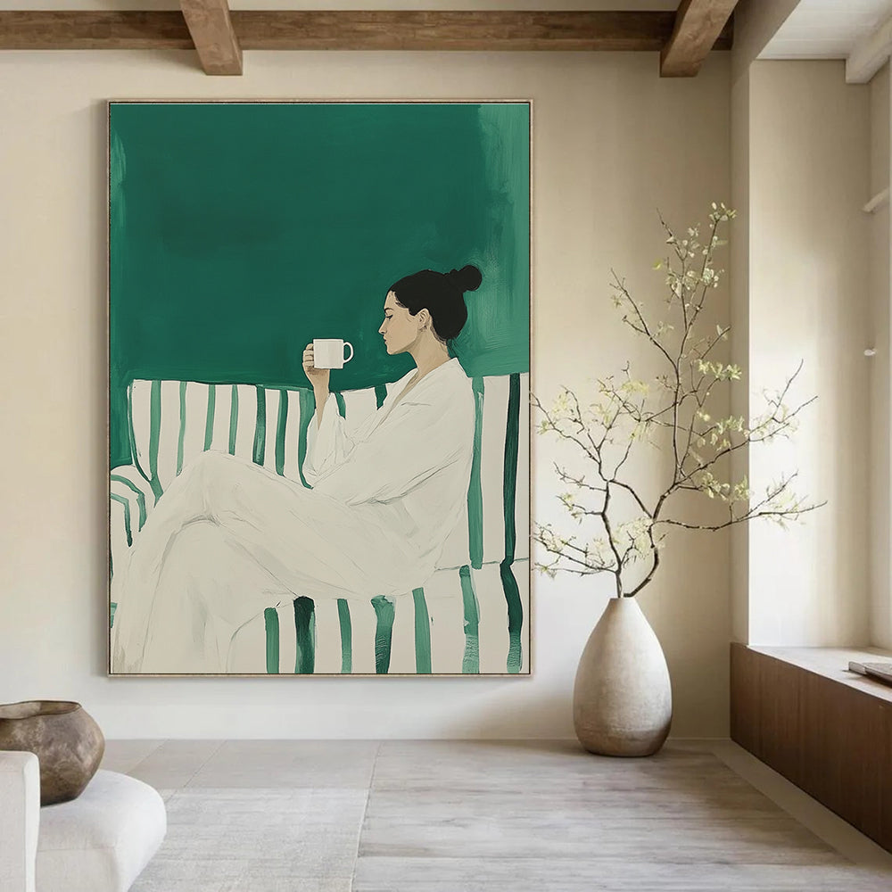Fascinated by quiet moments, the artist painted a woman enjoying coffee. The simple colors and composition capture a sense of calm and routine. It celebrates everyday peace. In a cozy home living room, it adds a relatable, homely touch. In a relaxing home café, it creates a warm, inviting atmosphere, perfect for sipping coffee and unwinding.Handmade Acrylic/oil painting on canvas, Unframed/Not stretched. Packing: Rolled and shipped in a solid tube. The painting come with EXTRA 2-3 inch white border around for stretching or framing. Delivery time: You will receive the painting around 7-12 days( 3-5 days to finish the painting, 5-7 days to your home.by Fedex And Dhl)