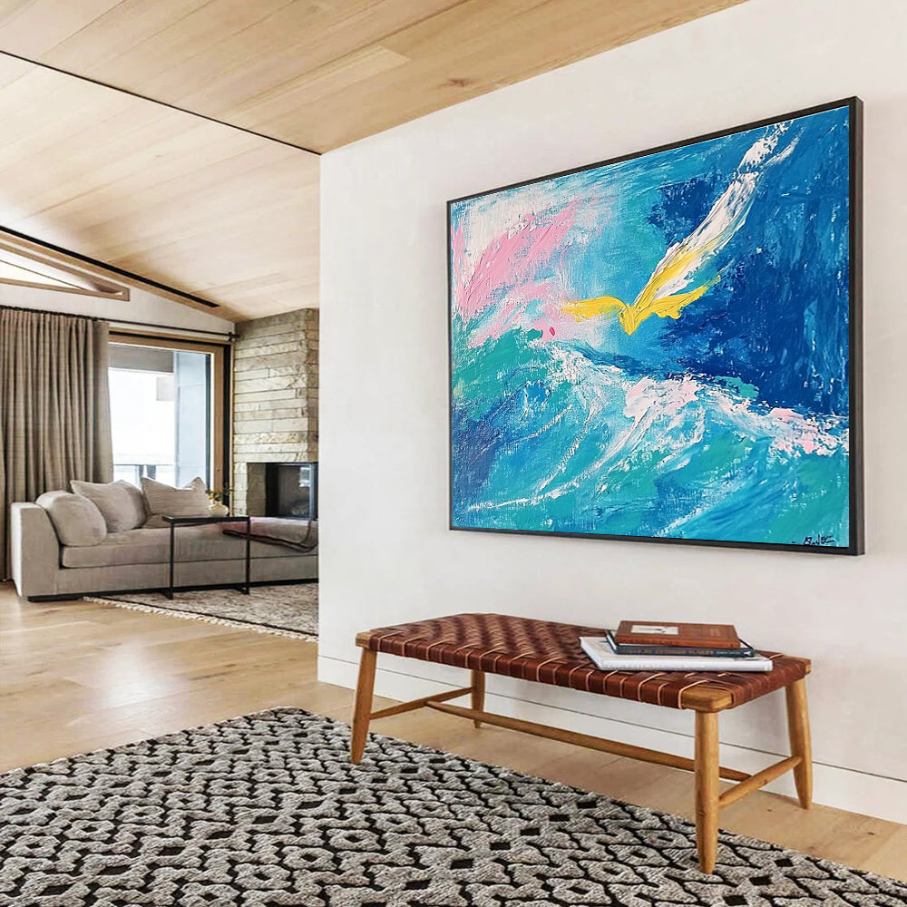 Inspired by freedom, the artist painted a yellow bird soaring over waves. Using dynamic brushstrokes, they captured movement and the sea’s power. Ideal for a nautical nursery to inspire little ones or an adventure - lover’s study to spark wanderlust.Handmade Acrylic/oil painting on canvas, Unframed/Not stretched. Packing: Rolled and shipped in a solid tube. The painting come with EXTRA 2-3 inch white border around for stretching or framing. Delivery time: You will receive the painting around 7-12 days( 3-5 days to finish the painting, 5-7 days to your home.by Fedex And Dhl)